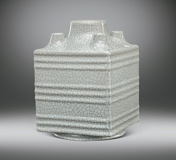 此仿哥釉五孔瓶造型敦实沉稳,胎体厚重,上部折肩五孔的设计颇为别致,中间开一大孔,四角环绕四小孔,孔与器身相通,于稳重中透出灵动,瓶身凸出三组弦纹,令整体造型更富变化的韵律。通体施仿哥釉,釉质肥润,布满不规则细密开片,再现哥窑之釉色恬淡素净,极为古雅。底以青花书“大清雍正年制”六字三行篆书款。